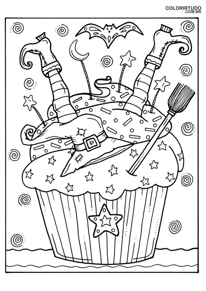 Home - DESENHOS PARA COLORIR - Desenhos de halloween para colorir cupcake com bruxa dentro de pernas pro ar