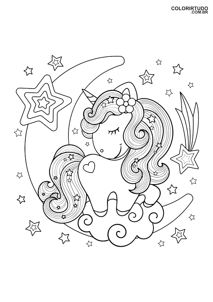 Desenho para colorir Unicórnio kawaii lua estrela para imprimir